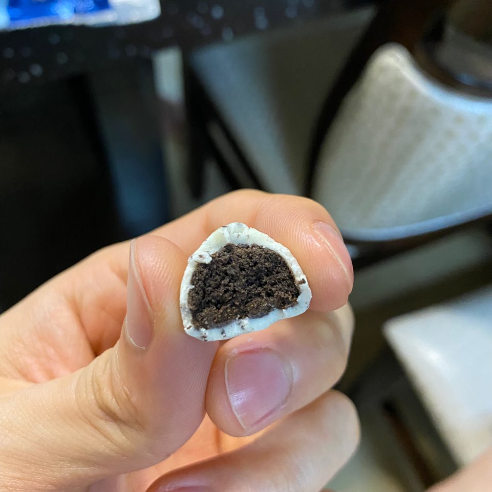 한입 베어 무니까 화이트 초코안에 미쯔 쿠키가 들어있더라구요 ㅎㅎ 부드럽고 촉촉한 화이트 초코와 쿠키맛?